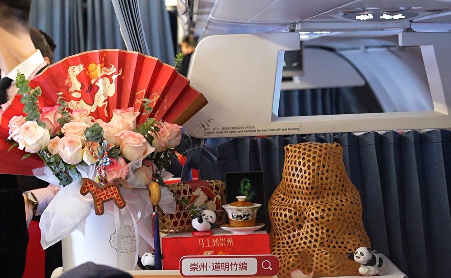 r登机时,每位游客皆收到了一份稀奇准备的“非遗礼包”,内含竹编体验材料、崇州景区门票、秉性书签、民宿优惠券等12种礼品。航班还成立了“赶紧有礼”抽奖时代,庆幸游客得到了竹编盖碗、温泉栈房住宿券等具有崇州秉性的奖品。