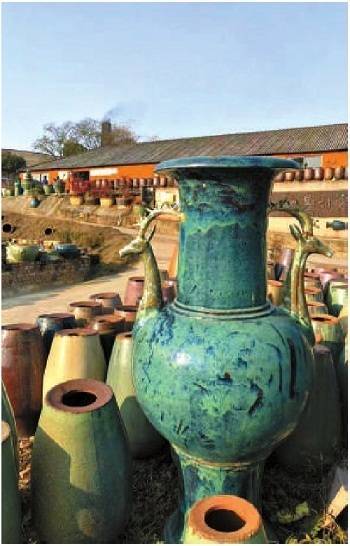 r四下无东说念主,我便直接往里走去。只见一方深红色砖块砌就的池塘,盛着淡淡的天水,许是用来清洗陶器上的污渍。数百只绿色陶盆、陶瓮嵌入在砖墙内,围成了一座陶城。还有效陶瓶、陶罐垒成的艺术品,大小不一,多为深褐色、乌绿色,有的呈塔状,有的鬈曲周折,形似盘旋的巨龙。