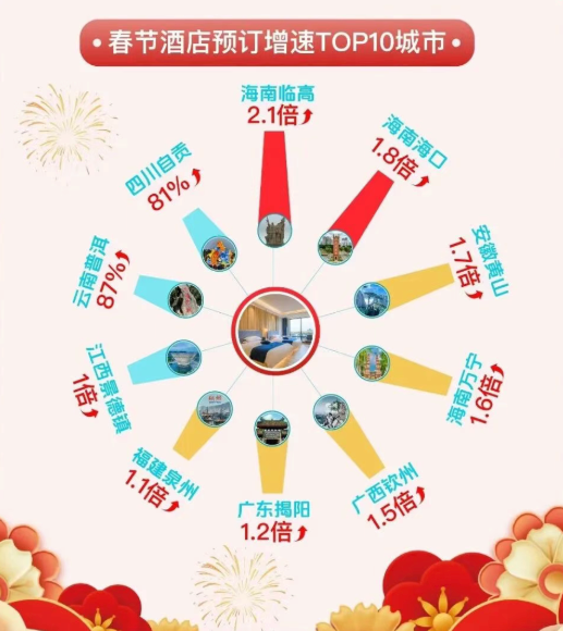 去哪儿发布的春节旅社预订增速top10城市