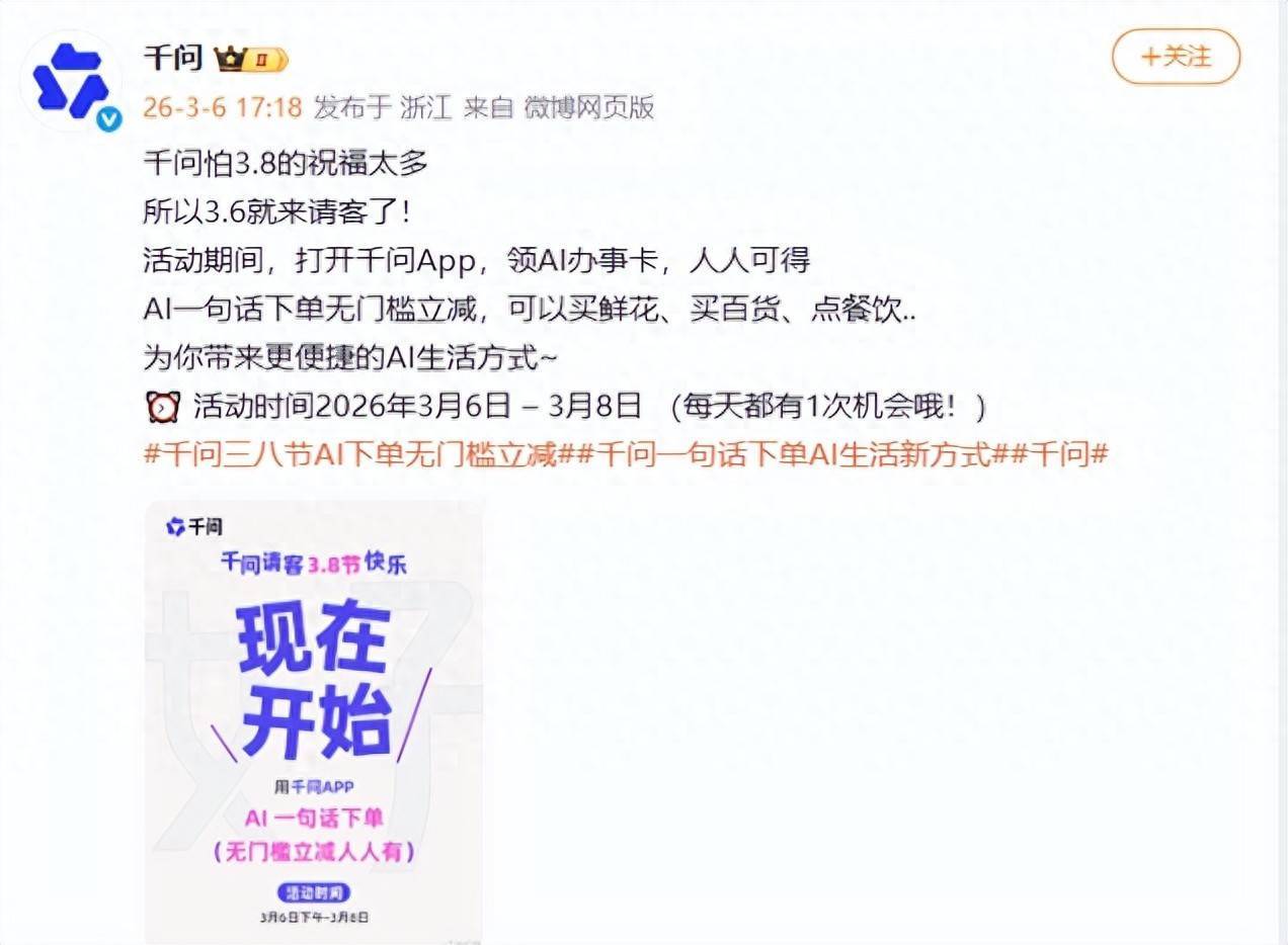 3月6日下昼,阿里旗下千问APP正经上线妇女节宴客活动。据先容,本次活动将合手续至3月8日,时代用户掀开千问App,进入“千问宴客”活动页即可领取“AI处事卡”足球外盘网站app官网,享受AI一句话下单无门槛立减优惠,适用于购买鲜花、百货、餐饮等。
