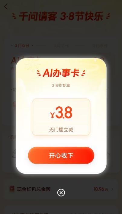 大象新闻记者体验发现,掀开千问APP后,点击进入“千问宴客”活动页即可参与抽奖,记者抽到了一张3.8元的“AI处事卡”,页面显现“当日有用,请尽快使用”。