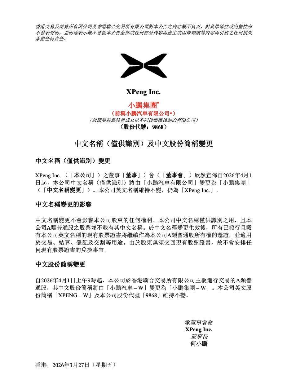 自2026年4月1日上昼9时起,公司于香港集结交往统共限公司主板进行交往的A类平常股,其华文股份简称将由“小鹏汽车–W”变更为“小鹏集团–W”。